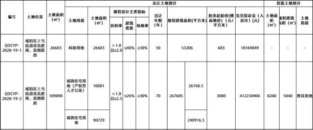 编号QDCYP-2020-19-2地块的土地面积109090㎡,规划建筑面积267685㎡,土地用途为城镇住宅用地(包括产权型人才公寓),容积率>1.0且≤2.5,建筑密度≤26%,绿地率≥30%,出让年限为70年,拍卖起始价3080元/㎡,竞买保证金412234900元。