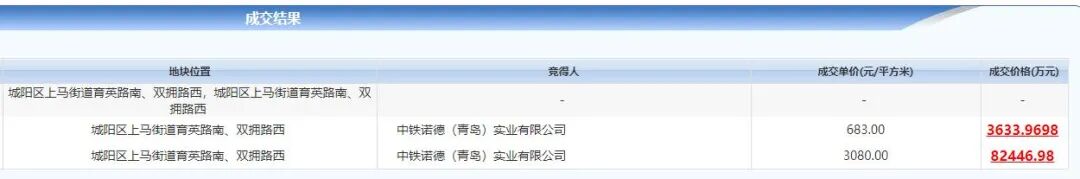 10月22日上午,位于城阳上马街道一宗科研用地和一宗住宅用地在网上进行拍卖,土地面积共计135693㎡,最终,两宗地块被中铁诺德(青岛)实业有限公司(中铁建工)分别以683元/㎡和3080元/㎡楼面地价成功摘得,总价约8.6亿元。