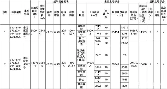 根据出让要求,1号地块商业部分产权必须保持完整,土地竞得人3年内不得分割转让,只允许整体转让或销售,且符合项目内产业运营方向。(四)因地铁5号线建设的需要,1号地块项目预留(无偿划拨)地铁设施用地(地上部分约400平方米,地下部分约2000平方米),土地竞得人在项目规划方案审批前,按照《青岛市轨道交通条例》有关规定,先行征求地铁办意见。2号沾化路2号商住、商务金融、餐饮和其它商服用地,占地1.41万㎡,容积率2.83,建面3.98万㎡。其中住宅用地1.94万㎡,商业商务金融用地1.55万㎡。起始楼面价10430元/㎡,起拍总价4.16亿元。竞买保证金2.08亿元。
